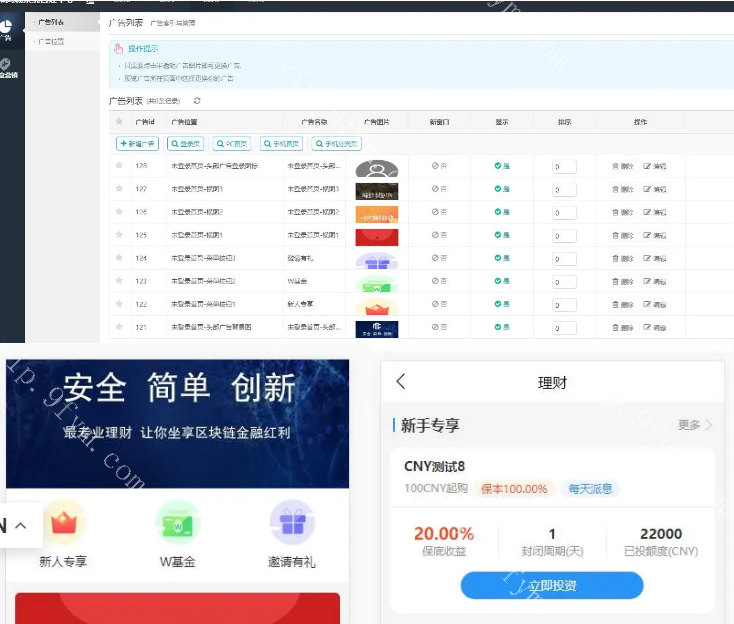 一款投资理财程序源码,可以自行添加货币。支基金产品和定期产品;可产品可设置日结或结束后结算;可设置产品是否支持赎回;可设置产品周期和封闭时间;支持设置起购金额和上线金额;支持注册新人红包功能;支持直推奖励比例;支持优惠券功能,可给指定账户发送优惠券;