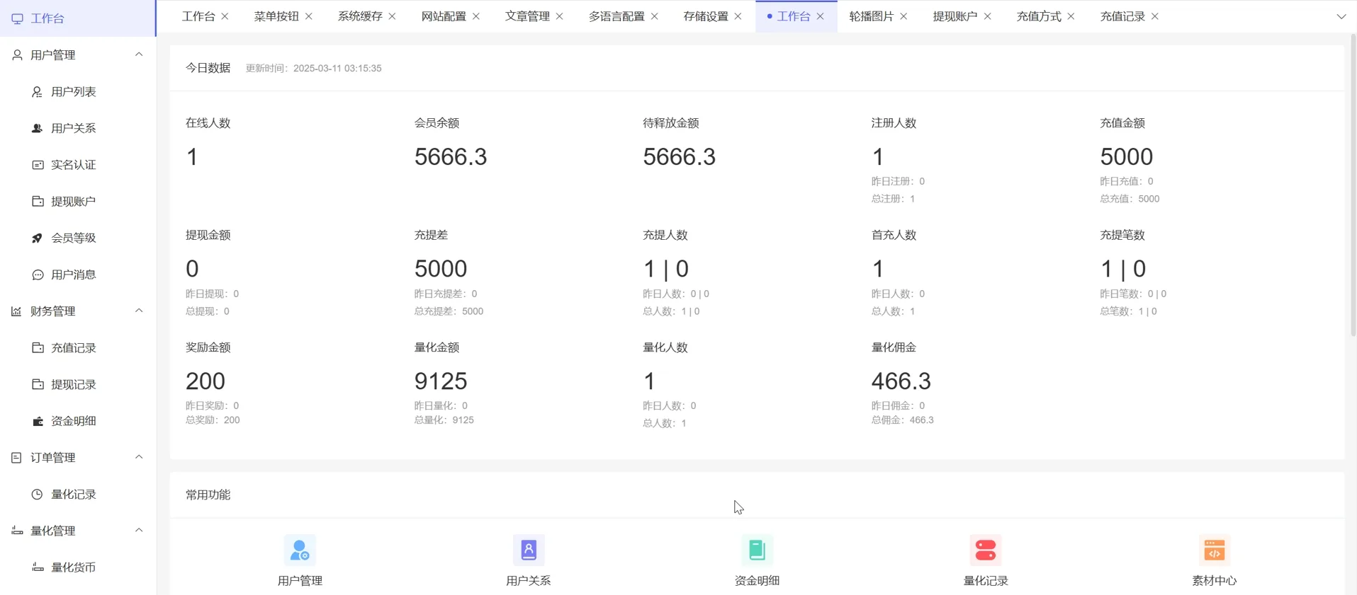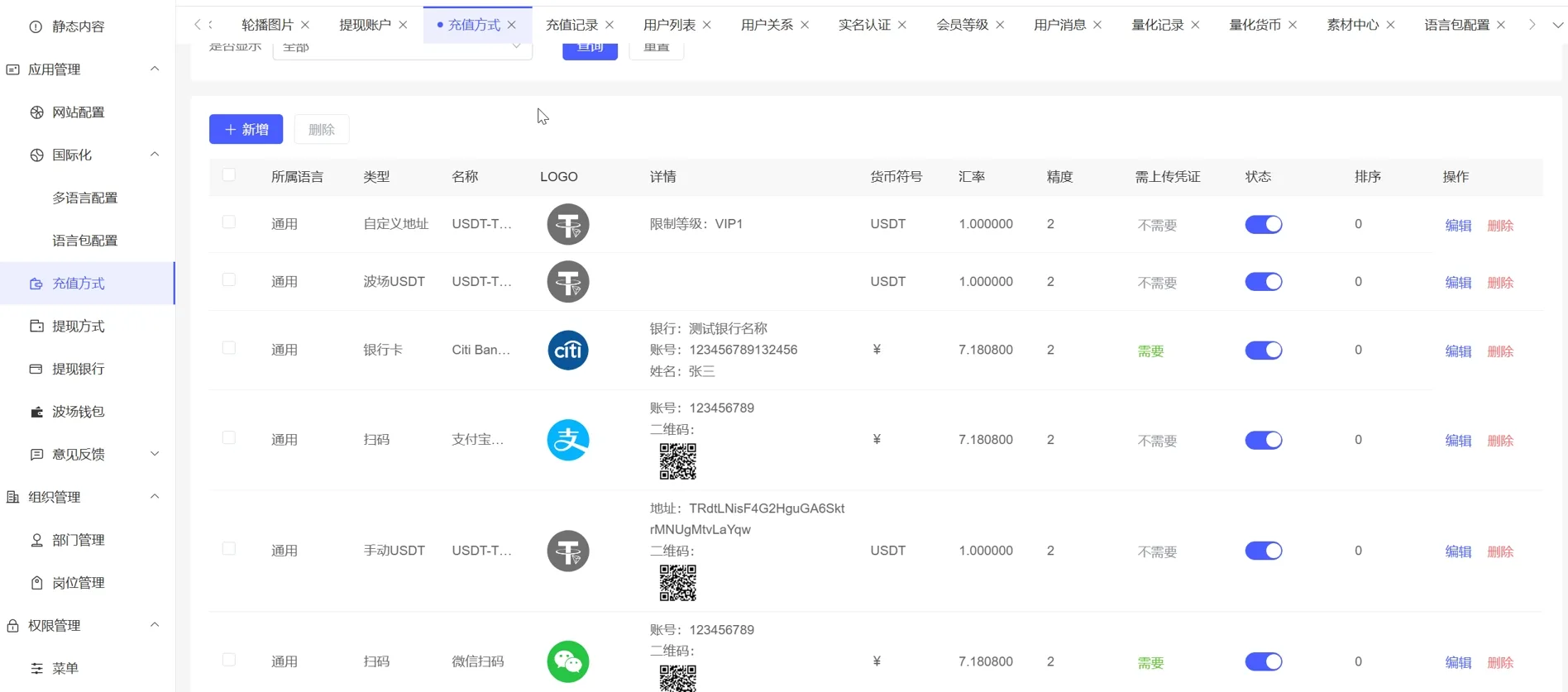 充值功能:微信扫码、支付宝扫码、银行卡转账、USDT手动转账、USDT自定义地址、USDT自动充值(对接波场官网)。