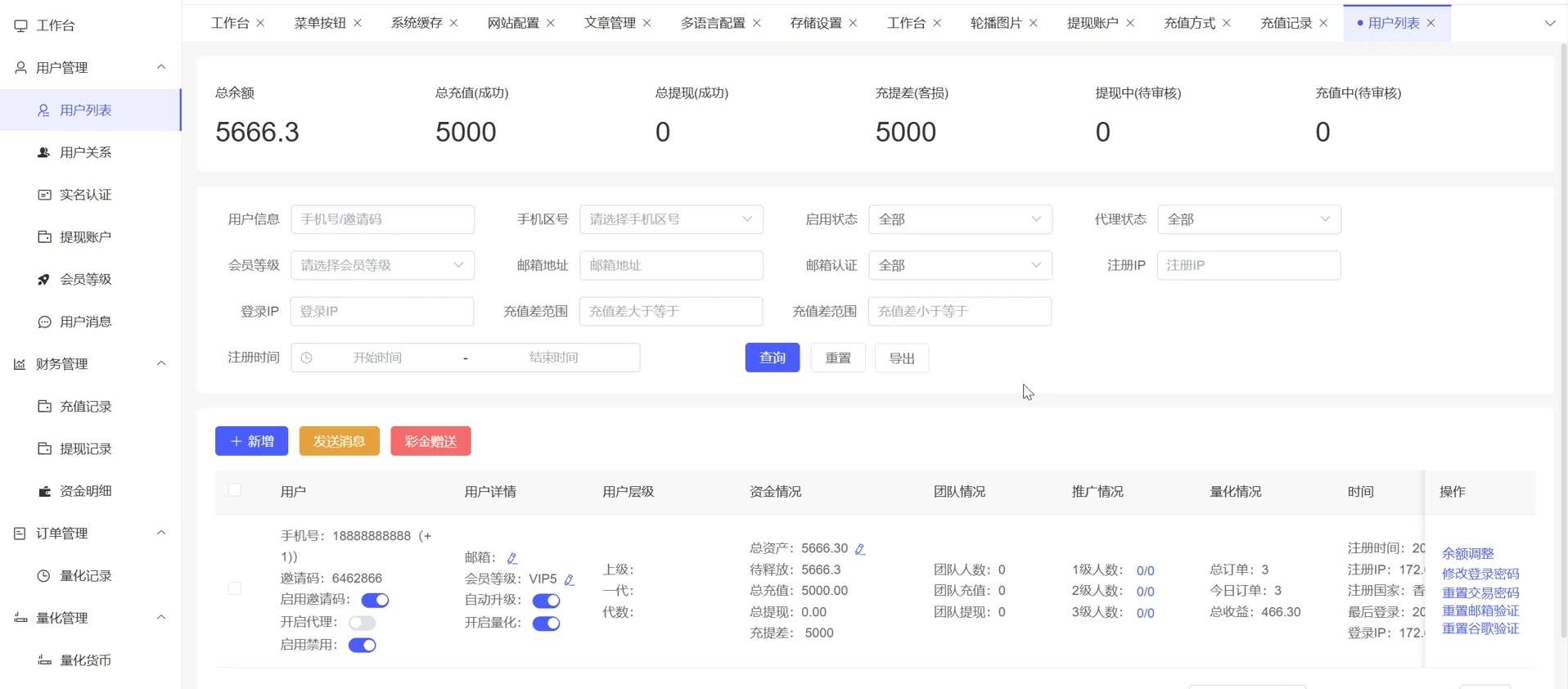 19、代理线功能,后端开启用户为代理,即可登录代理端查看代理下级用户情况。
