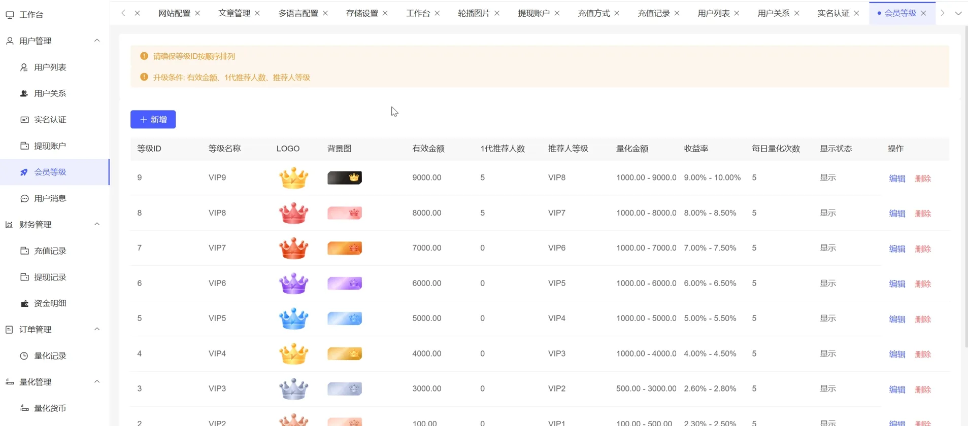 3、VIP等级划分,升级条件: 用户有效金额、1代推荐人数、推荐人等级。